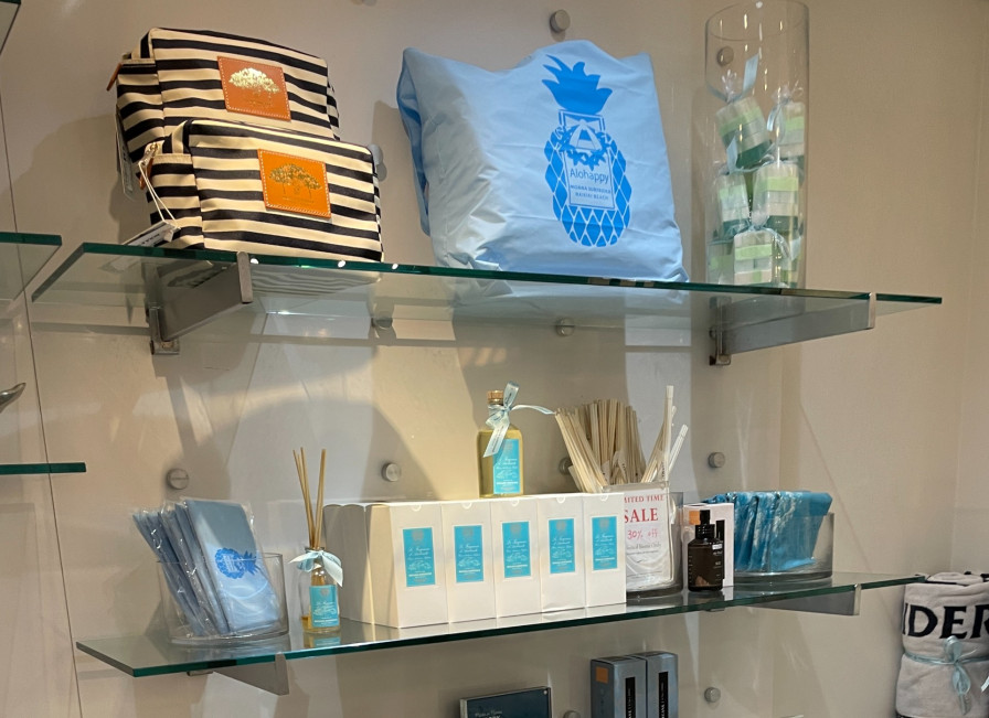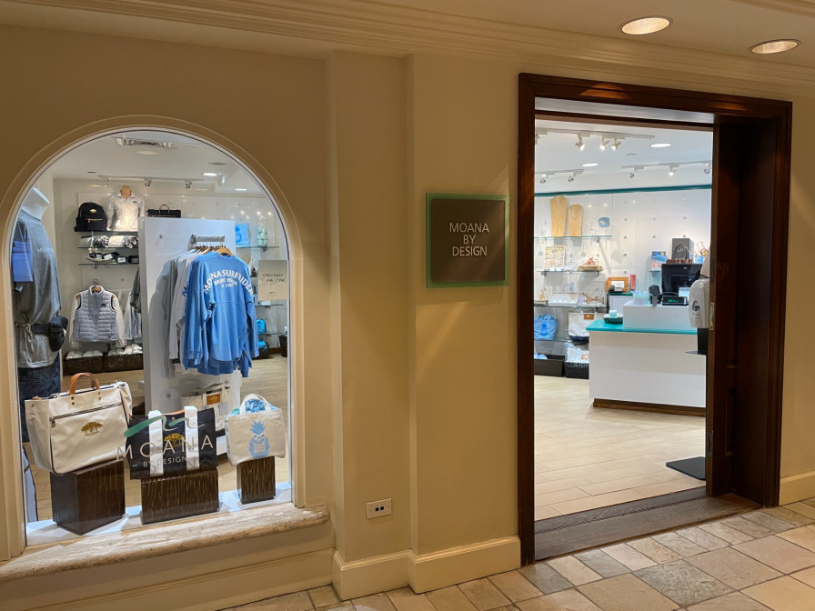 ワイキキの心地よい海風を感じながら、カラカウア通りに面した歴史あるモアナサーフライダーのメインエントランスを抜けると、そこには公式ショップ「モアナ・バイ・デザイン」があります。