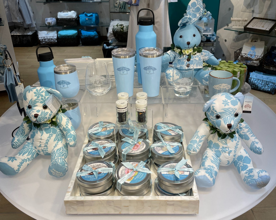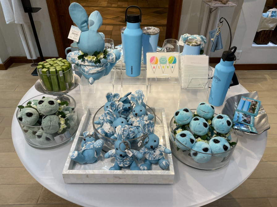 ショップ店内には、モアナサーフライダーでしか手に入らない限定アイテム、アロハプリントのぬいぐるみやモアナブルーを基調とした商品が並んでいます。